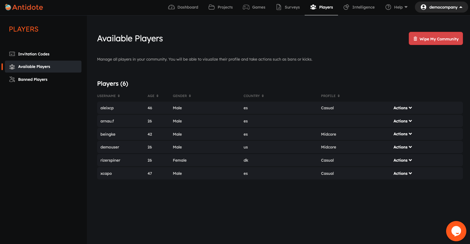 You can send invite links directly to your existing community or recruit specific profiles and demographics from Antidote’s player base if you need particular types of players.