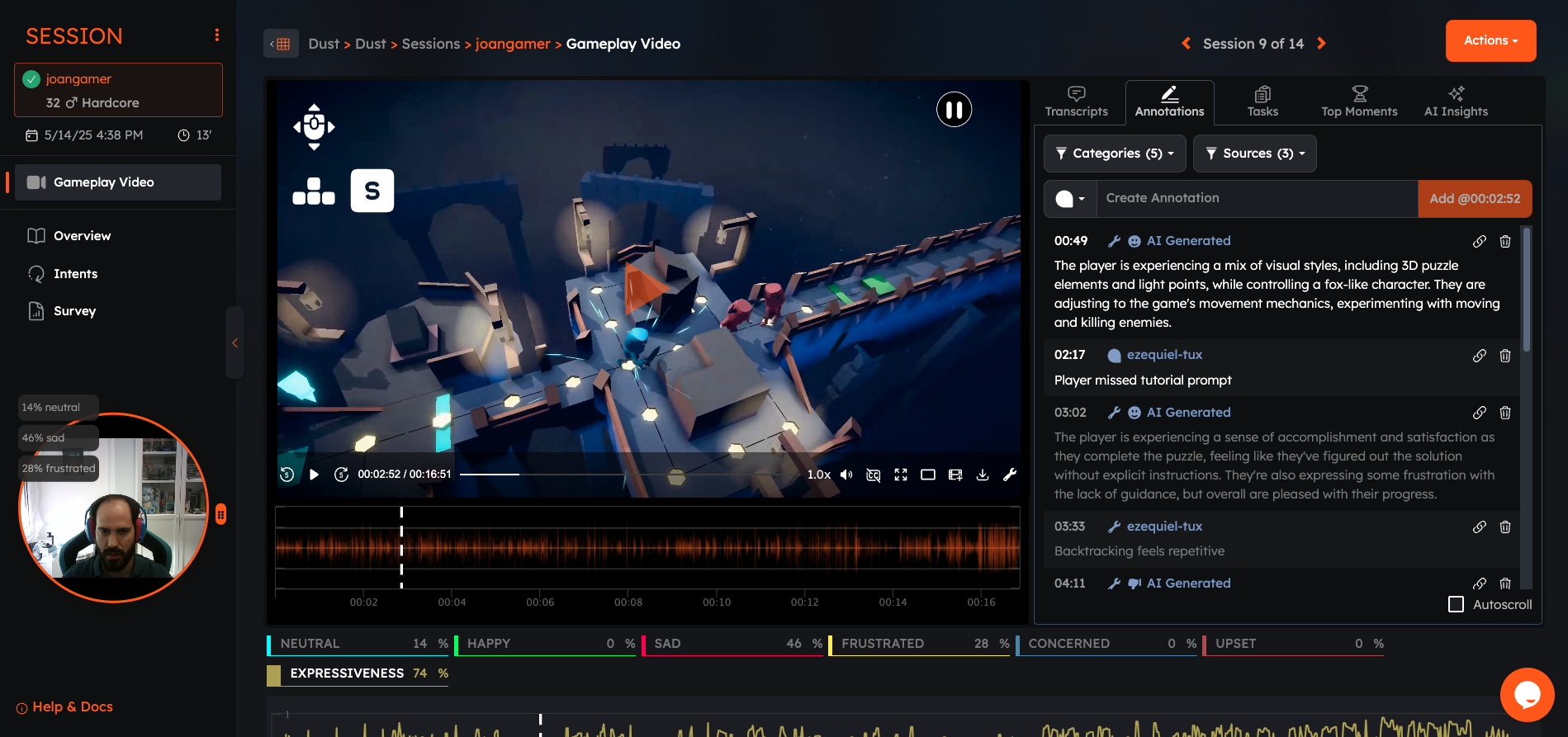 Access individual sessions with the flexibility to review each playtest separately. Within each session, you have a wide range of data analysis tools like transcripts, AI insights, controller inputs and emotion detection.