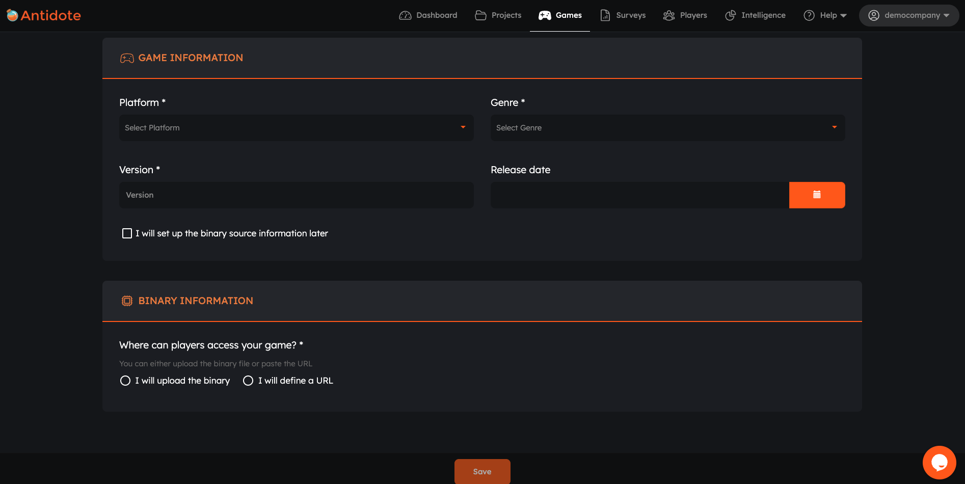 Antidote supports games on mobile, PC and browser. Depending on your build, you can upload a binary source file directly or provide a URL link.